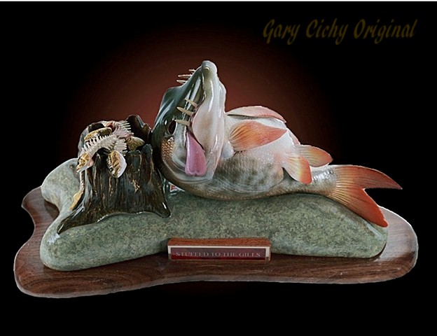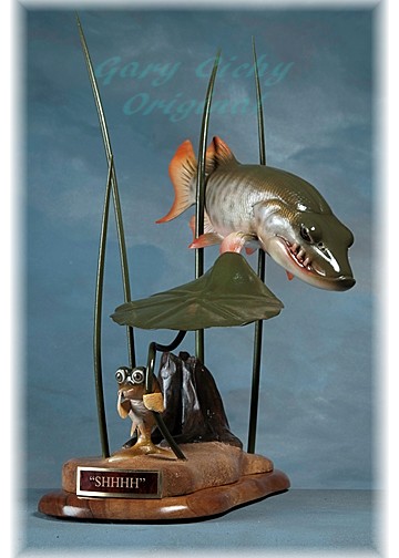 | Thought you might enjoy this musky caricature wood carving by my friend Gary Cichy. Gary won a 1st, 2nd, 3rd and best of category in the last World Fish Carving Competition in Springfield Mo. It's one of many musky caricatures Gary has done. Hope you like it. | |||