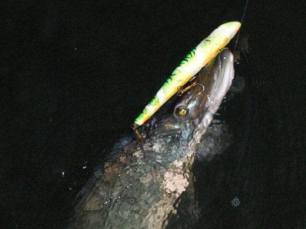 Was going to hand land this fish due to the wrap, and not wanting to net it, but when I grabbed, this one was too wide to get a grip on. Snapped a pic in the water before starting the unwrapping, unhooking process, always kind of a pain in the dark in the water. Luckily fish thrashed around one more time shortly after this, and left me only one wind and one hook to undo when it was done. I would guess somewhere between 37-58" ...