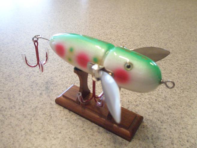 Crazy crawler have hand cut and soldered stainless wings/brackets. All baits have thru wire stainless shafts, soldered loops, paper clip hanger connecting belly hook to main shaft etc. All baits are made of cedar, turned out one at a time. Lures with eyes have glass eyes.