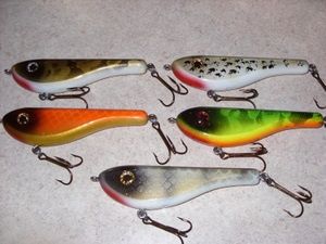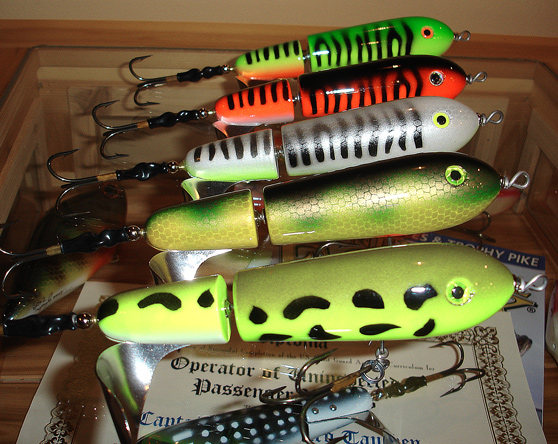 Here is a quick look at a few more of my new custom colored Choppers. Front to back they are Leopard Frog, Perch, White/Chart. Belly Muskie, Orange Muskie, and Firetiger Muskie.