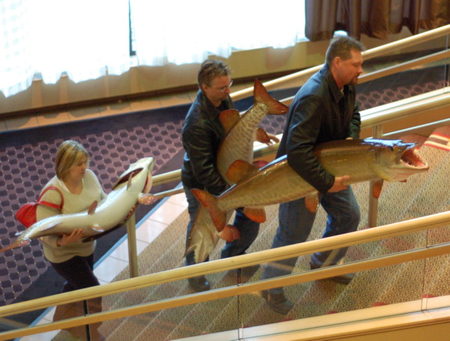 Posts: 123 | The picture I posted is of Rick Lax and his associates carrying replicas to the 2006 Muskies Inc. Spring Board meeting. All were done free of charge and went to the anglers who caught the largest fish in their divisions. I'm sure it would cost around $800+ for a replica of that size, and I think all three of these were around 50+ inches. Can't recall. | ||