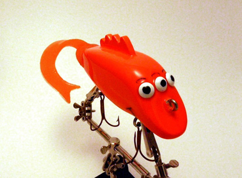 Posts: 225 Location: Nordeast Minneapolis | I'll be posting some more 'serious' options in a bit for comments and critiques, but I figured I'd toss this one out first.... Construction: Western Red Cedar, with approximately 3/4 oz. lead, and two 4/0 hooks. Blaze Orange rattle can paint, with three coats of e-tex over the top. Hand-poured, custom-designed soft plastic tail. Dimensions: 4 1/2" of wood (hehe, hehe) and about 5 1/2" of plastic. Action: Unknown. At least, unsure. I don't have a convenient winter lure testing option, so I can't be sure it'll work... yet. I'm hoping for something similar to a Swim Whizz on the shallow eyelet. (If anyone in the Mpls/St.P area has access to a testing tank, I'd consider a trade for testing this and few other lures, though!) I've decided it has to actually work before I make more. Eyes: Three. Radioactive: Possibly. Probably. Anyone know of a musky lake near a nuclear power plant? Maybe near Springfield?! Attachments ---------------- blinky_1.jpg (97KB - 166 downloads) blinky_2.jpg (99KB - 147 downloads) | ||