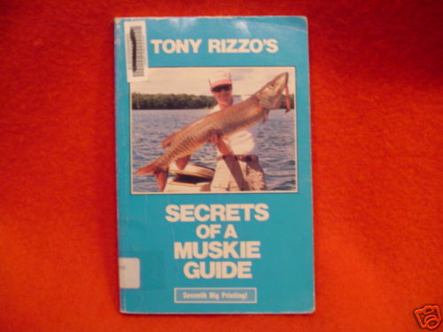 Location: Minnetonka MN | Tony Rizzo's Secrets of a Muskie Guide, seventh printing, 167 pages. This is a former library book. It has a bar code, spine label, discard stamp and library writing (Phillips, WI). It has a water stain on the top. Lots of information and photos, everything you wanted to know about fishing muskies by the legend Tony Rizzo, Wisconsin fishing guide, info on fishing in various seasons, graphs and personal thoughts.