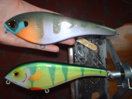 | hey guys, here's a couple gliders i have been working on. see what you think, the blugill will swing a good bit with rod taps, up or down. the perch (as you can see is still spinning) is actually a swimbait i came upon by mistake. it will lazily swim with a steady reel, side to side with a little roll. looks just like a dying fish. i really like the way they work, but i want to work more on the "3d" aspect of finishing. i am anxious to do more, but i am too dang slow.....thanks guys!! |