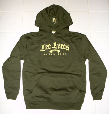You can see the design of my Green Hoodie by going to the "Merch" page on my lure site. Then page down until you see the green T-shirt with "Lee Lures, est. 1999" on the front. Well, that is what the front of the Green Hoodie looks like. There is also my signature "LL" embroidered on the hood. There is nothing on the back.