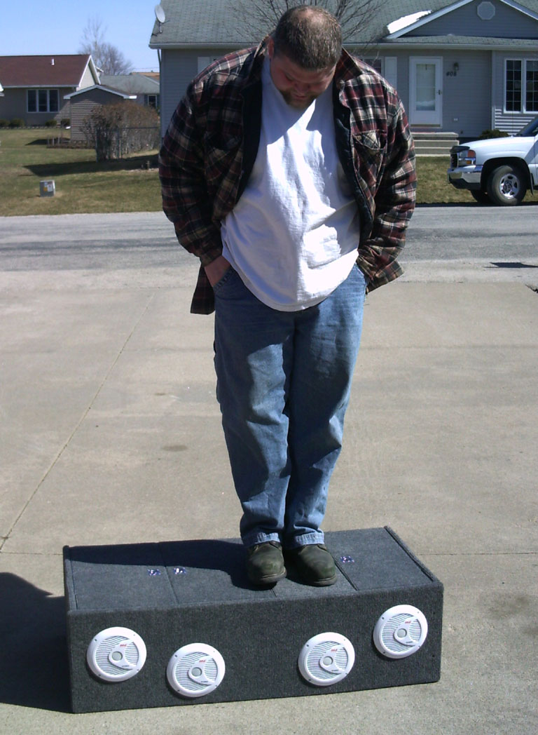 It is Steel angle Iron on top, one inch tube supports. Welded, no gas, just a wire fed hobart. Etexed the ply-wood, then painted it.Back is open, top is 5/8s plywood, front and sides are 3/8s. PVC downspout, no noise at all. Here is a picture of my 350+ pound 6 foot 6 brother in law, testing it for strength. Not sure on the weight, but I can put in in and pull it out by myself. Steel was 70$, Stereo was about 130$, carpet and glues was about 25$, etex was 20$, latches were 15$, I salvaged most of the plywood from work. PVC Downspout was 42$. The miscellaneous is where it really adds up. I made numerous trips back and forth to Menards for, piano hinges, tools, screws, paint, nuts, bolts, paint etc. Lots of time in this build as well. My brother in law wired it all up, welded it all, I did most of the grunt work.