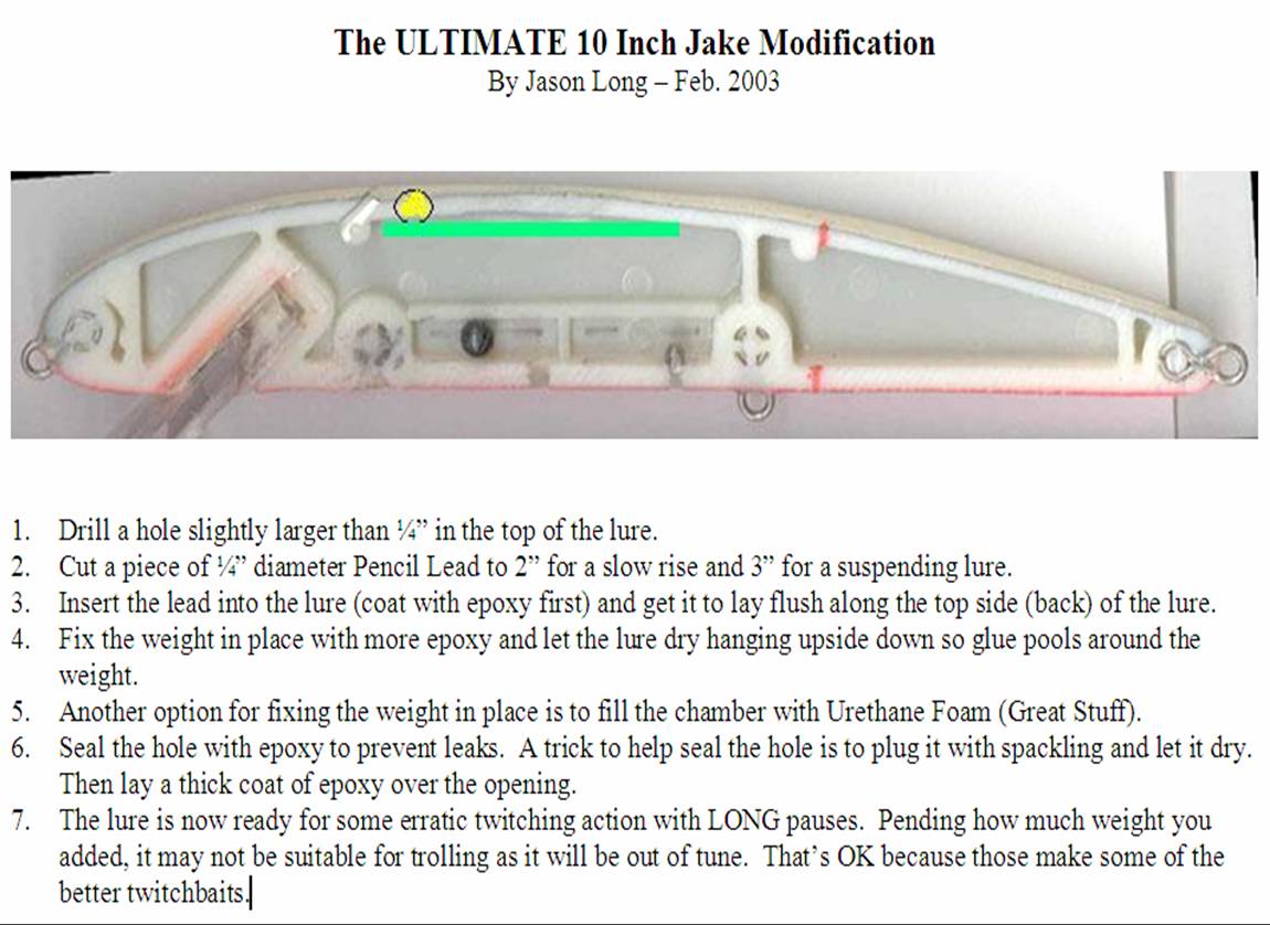 I weight my Jakes with water. Bought a seringe from good ole Fleet Farm for administering medicine into livestock. Holds 12cc of water I think. I drill a hole in the top of the Jake slightly off center (as if it is on center you risk splitting the bait seam), squirt water in, apply silicone to a sheet metal screw, and screw in the screw. That way if I want to add more later, or take some out I simply unscrew and go. I will tell you I use no less than 12cc and no more than 25cc of water in a 10" Jake. 8" use less of course. I like mine to have a slow rise just like I like my DDD's.