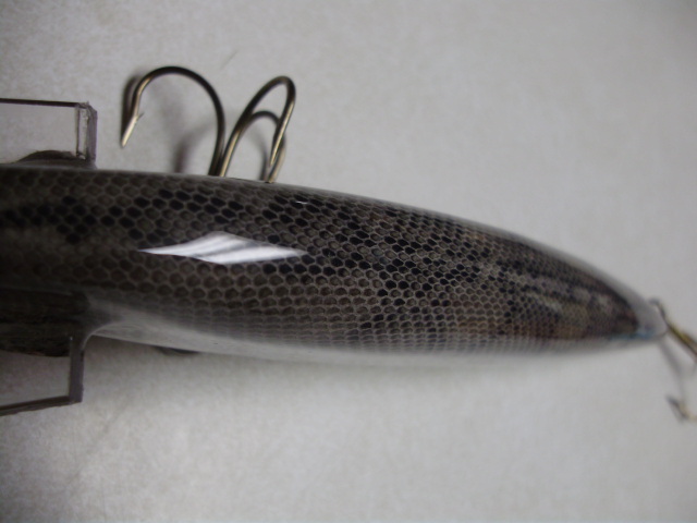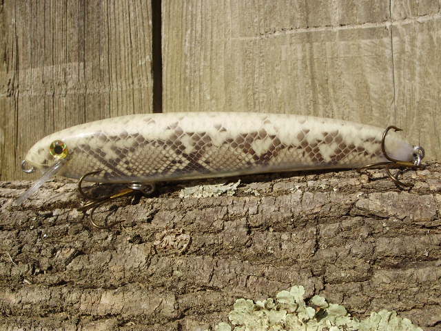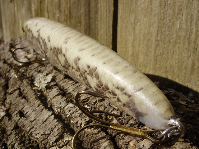 Posts: 909 Location: South-Central VA | So I got the idea to wrap my muskie blanks in snake skin. I've been doing it on rods for awhile and this seemed like a natural step to move on to lures. I picked up a bunch of skin at the ICRBE in Hight Point back in Feb and I'm getting around to playing with on some lures. Here's number 1. It's 8", about 3oz, and swims with a nice, wide wobble. And, thank God, it floats! Attachments ---------------- P3280044.JPG (78KB - 193 downloads) P3280045.JPG (78KB - 193 downloads) P3280046.JPG (81KB - 182 downloads) | ||
