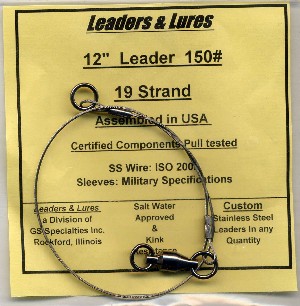 Posts: 41 | Multi-strand for most applications. I also use Leaders and Lures leaders. The 49 strand, 120 lb. is one of the most versatile I've seen. Used to use alot of single wire, 174 lb test w/ haywire twist. Then had a pull test done and was amazed that the twist would unravel I believe @ around 70 lbs. For you guys that like stiff wire for walk the dog - try the 100 lb, 21 strand - makes the lure glide much better and does not wrap-up like you would think. Also has fluoro available. As for using crimps, if done correctly (with the proper tolerances and materials) are great. Genes are all crimped to military specs and glued w/ a compound used in the aerospace industry. He has yet to have a crimp let go. You owe it to yourself to check these out. Simply the best. Check out "Smokey's Musky Shop" for the video on these. If you still don't believe, call John @ Smokey's and ask him about Crimps - he used to hate them - now its the only leader he will sell. | ||