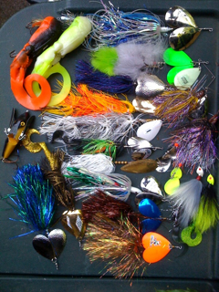2 musky mania exos, 2 lungen nutbusters, 2 M&G spinnerbaits, 1 hi-fin creeper, 1 custom steve jonesi double10, 1 double cowgirl, 1 llungen DC10, 2 figure eight bucktails #10blades and #8blades, 2 musky mania turbines #12blades and #10blades, 1 custom made double willowleaf, 2 single#10 mojo bucktails, 1 gerrysgirls double #9blade, and 1 marabou double #10.