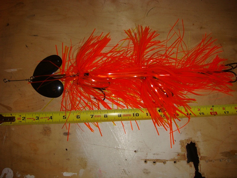 Location: Duluth, MN | Had Jim make up a custom magnum tail for me. We've had a lot of luck with black and orange so i decided to try and spin it around and go orange and black. Now this is a big fish bait!! Went with the Indiana blades to try to keep the elbow pain reasonable.