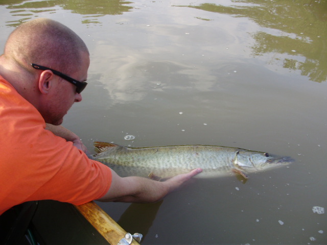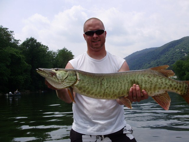 Posts: 909 Location: South-Central VA | I got in another bass/muskie float on the river today. My buddy and I weren't able to get on the water until 8:30 and being the first day of bass season, the river was packed! On top of that, the weather was bright and sunny so I didn't expect much for the day. We went straight to the hole where I missed the big muskie two weeks ago but there were 6 boats there. We made one float through and decided to move. We headed downriver and did some bass fishing the rest of the morning. Around 1:30 we came up on a good eddy that I hadn't fished much in the past. We worked down through the hole without any action but on the last cast I was planning on making, this one rushed out of the shallow water along the bank and hit the olive minnow I was throwing. I think this lure is going to be a hot one for me, it's the same one I used two weeks ago when I had the upper 40's fish on. The river is heavily pressured and most of the legal fish don't make it back in the water, so I feel blessed to have had action on every trip this year. Sorry for the bad picture, my buddy chopped her tail off...I need to send him to photography school. jeremy Attachments ---------------- P4200039 (Copy).JPG (69KB - 216 downloads) | ||