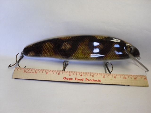 Posts: 909 Location: South-Central VA | Thanks Dick. I talked with the gentleman I built them for and he's been doing very well on them. He just won a pike tournament (I don't think he was using them exclusively) and he caught his biggest fish on one. I'm disappointed with myself for not making some extra python skin crankbaits in the smaller sizes for my own box. I think they'll do well on the river. The smaller sized lures in the 5-6" range seem to do well locally. I was out in the stormy weather on Saturday and had a 47-48" blow up on my Olive Minnow (pictured above) about 10 feet from the boat. She hit my line and leader 6" in front of the lure and I had her tangled up for about 2 second before she bit me off. She left me standing there with my heart pounding and my lure just floating there in the water. I was relieved that she swam off without a face full of hooks! jeremy Edited by bowhunter29 6/9/2011 8:20 AM | ||