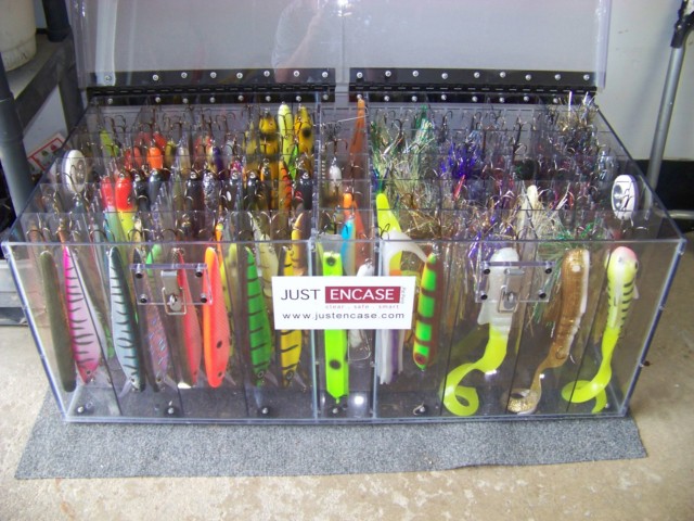 Posts: 439 Location: Lake of the Woods, Morson, Ontario | Yup, call Bob at Just Encase and he can make you any size you want. I have a stock model with the lid removed that holds 14" jakes nicely with the lip of the bait sticking up over the top of the dividers and I love it. He can make them taller if you want them to hang like bucktails and other baits. Great guy. Great service. The best tackle boxes out there for muskie baits. I've bought 8 from him and they were all exactly what I wanted. | ||