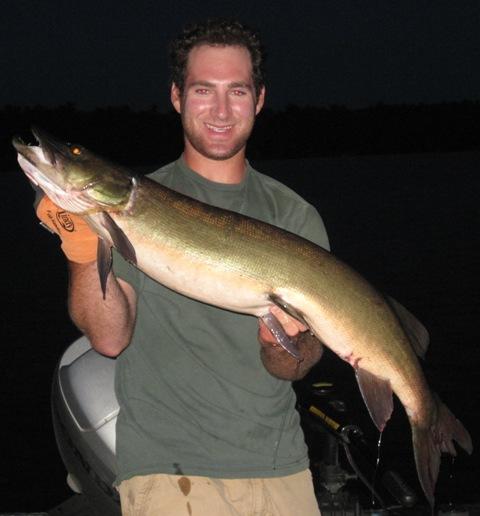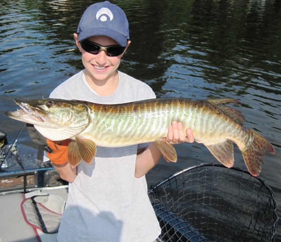 Water temps have been very warm at a blistering 80 to 85 degrees on the surface. With that said it is very important to try not to fight these muskies too long and only keep them out of the water as long as you can hold your own breath! Winds have been predominantly blowing out of the S-SW and lately the conditions have been warm, muggy and calm. Despite these typical “dog-day” conditions the shallow water bite has been surprisingly good. Bucktails, topwaters, glide baits and jerk baits are producing good action. Fishing the deep weed edge and also fishing suspended has been the ticket to catching these fish. In clear waters the deep edge is usually around 16 feet and in stained waters the edge is around 7-10 feet. Mid-lake humps are also producing well and we are getting a few good size bonus walleye fishing these areas at night with crankbaits.