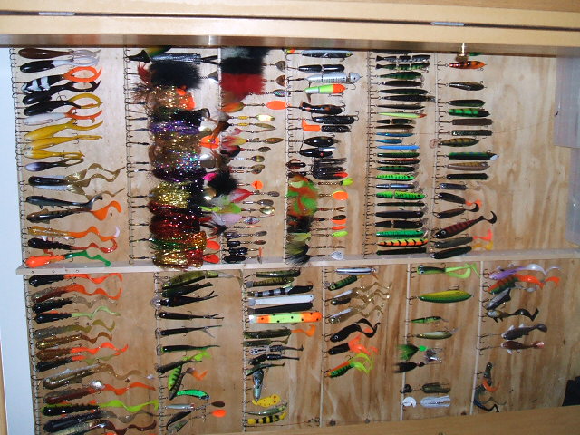 I put a long screw on the rows with heavy rubber to help the dowels from sagging. If u look next to the walleye heli-dawg u can see the screw. And yea some the baits will be for sale. When I get some time this winter I'll post the baits 4 sale.