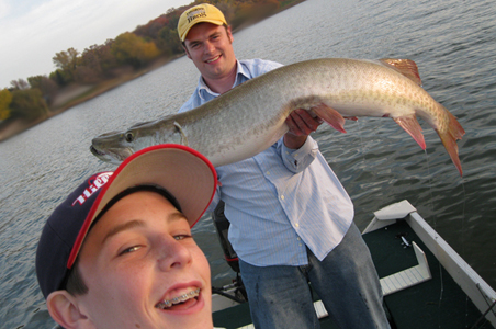 | My wife Barb, Jake (our lab) and I went out Saturday to Twin Valley and Barb got her first ever musky. A nice 40 incher on a sucker and quick set rig. It was pretty slow for us otherwise but there were a couple fish getting caught on suckers throughout the day by other boats. A good day to be out even if the fish were slow because when fall really gets here, she won't want to be out. Thanks to Dick Estes and Wally Haas for coming over and taking a photo for us since Barb didn't want to hold the fish and I couldn't hold the fish and camera at the same time. Jeff | |||
