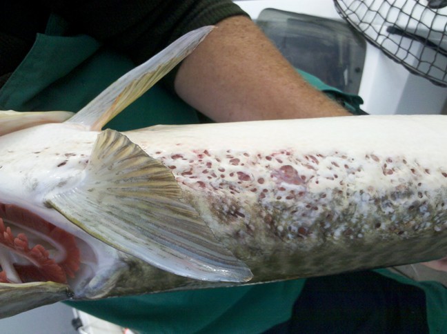 ..."I will forward to my GLFHC colleagues. My guess is a bacterial infection that’s eating away the flesh causing the formation of the ulcers. I’ve seen similar cases here at the hatchery where a lesion forms at the base of a ventral fin that eventually opens up into a single large ulcer. Death eventually occurs when the spine and/or abdominal cavity is exposed. ADDL (Animal Disease and Diagnostic Lab at Purdue) said it was ulcerative dermatitis caused by a bacterium. Tough to say which one since the open sores easily become infected by secondary infections. If he catches another one, it would be ideal to put the fish on ice and get it to ADDL as soon as possible."