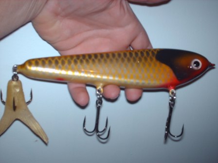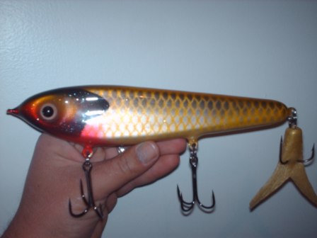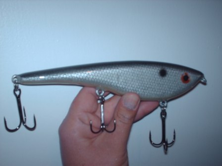 hi guys here are 2 really nice gliders i have for sale. the hoosier is a beautiful custom painted 9 inch shadglider in a gold redhorse scale pattern. i added glass eyes, and a boggs poured match tale. the bait really came together nicely. the other is a custom painted 9 inch fat boy glider in a silver metaillic shad scale, black back. lots of flash and a really wide glide, average of 3 feet or so with braid. paypal gift preffered. pm me. not interested in trades at this time. thanks!