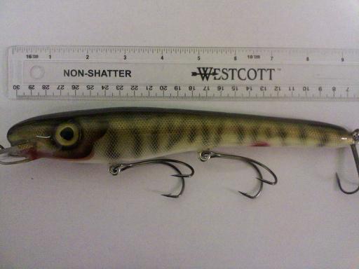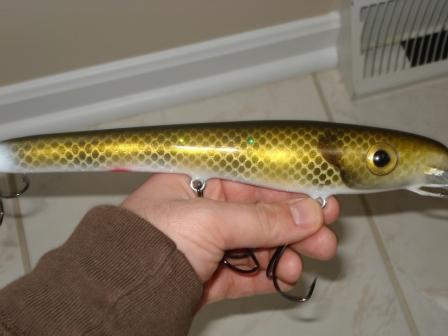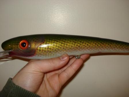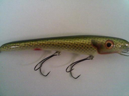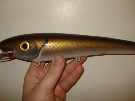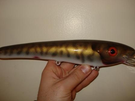 Posts: 77 | A friend of mine requested i make him some popular colors of the homemade baits i am making. I thought i would share them all with you. I am going to take them down to the river for the final check tonight. This bait is 9 inches in body length and 10 1/2 inches over all length. This is the first time I have worked with glass eyes, i must say its a bit different than working with stickers. When i get acess to a good camera I will post more baits and better pictures. These phone camera's just do not do the baits justice. Many More to come! Edited by MEISTERICS 12/29/2010 7:02 AM Attachments ---------------- $9 bass.jpg (21KB - 129 downloads) St. Lawrence.jpg (17KB - 135 downloads) | ||