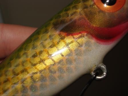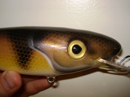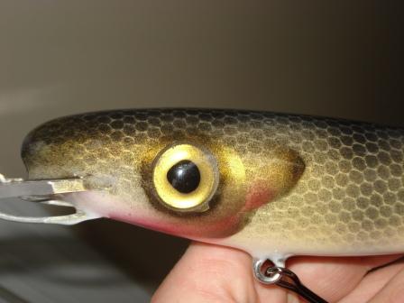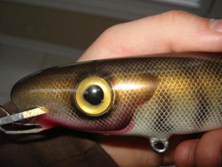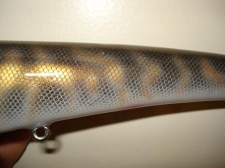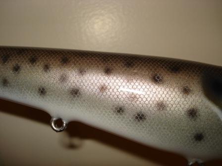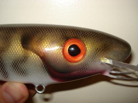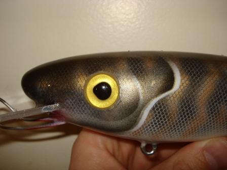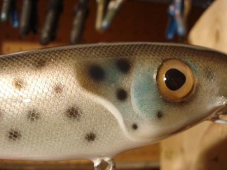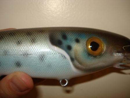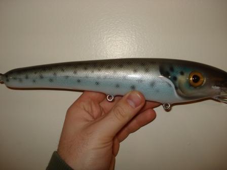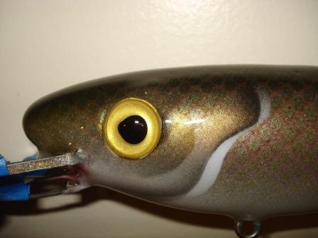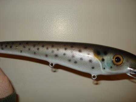 Posts: 77 | Here are some more that just came off the wheel late last week. This bait is 10.5 inches long and weighs 6.5 - 7 ounces. The depth range should be in the 15-20 ft range. Maybe we will get some soft water one day and i can actually test it? The pics do the baits very little justice, with the many layers of paint. The lip is 1/8 lexan stainless steel wire tie. 5 coats of epoxy 1 7/16 .092 Stainless screw eyes that are epoxied in. handpainted glass eyes The Gamakastu hooks should be coming in soon, I cant wait to stick myself. AGAIN. Attachments ---------------- St law.JPG (16KB - 122 downloads) Black Sucker.JPG (15KB - 134 downloads) Black Sucker Eye.JPG (22KB - 148 downloads) Black Sucker Belly.JPG (14KB - 127 downloads) Black Sucker Scale.JPG (25KB - 120 downloads) Orange Walleye1.JPG (15KB - 132 downloads) Orange Walleye Eye.JPG (58KB - 137 downloads) Orange Walleye Scales.JPG (22KB - 123 downloads) Blue Brown trour.JPG (15KB - 138 downloads) Blue Brown Trout Eye.JPG (17KB - 133 downloads) B Brown Trout Scale.JPG (23KB - 130 downloads) Brown Shad.JPG (16KB - 120 downloads) B Shad Belly.JPG (14KB - 117 downloads) B Shad Scale.JPG (25KB - 117 downloads) $9.JPG (15KB - 134 downloads) $9 eye.JPG (22KB - 133 downloads) $9 belly.JPG (15KB - 116 downloads) Reverse $9.JPG (16KB - 122 downloads) Rev $9 eye.JPG (20KB - 122 downloads) Rev $9 scale.JPG (21KB - 139 downloads) Rev $9 belly.JPG (14KB - 119 downloads) Brown Trout Eye.JPG (22KB - 117 downloads) Brown Trout.JPG (15KB - 119 downloads) Brown Trout Scale.JPG (20KB - 123 downloads) Green Shad.JPG (13KB - 121 downloads) Green Shad Eye.JPG (20KB - 125 downloads) | ||
