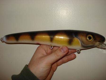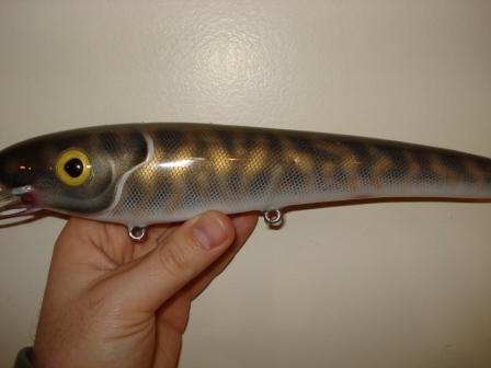 Posts: 77 | PepsiBoy, For this bait i am sure if I shortened the lip I could get the bait to max out at 10ft for 100 ft of line. The action of the few baits i swam seems is fast and tight wiggle. but the above model really likes to dig. i am going to guess its in the 15 ft range. maybe as much as 20. I have a 10.5 inch bait that i am getting ready to paint here soon that will likely. I think with the steaper lip angle and shorter lip it should be right up that alley. Hard water makes dive curves challenging! | ||