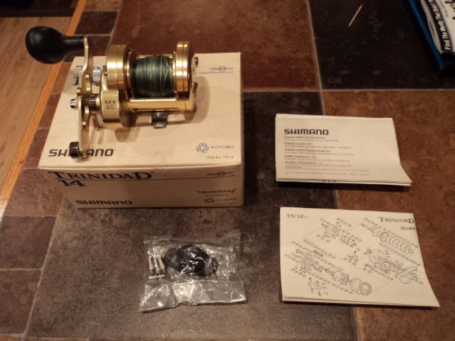 I have a barely used Shimano Trinidad TN-14 right hand for sale. This reel is in like new condition and is spooled with 80# Power Pro. This is a high speed (6.2:1) reel, excellent for burning those bucktails. I have too much stuff and must sell some off. These are going for $300 brand new. I am asking $240, shipped in the states for this reel. This includes, the reel, box, all paperwork and brackets.