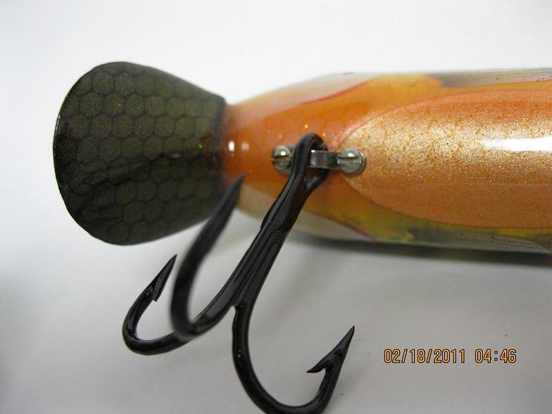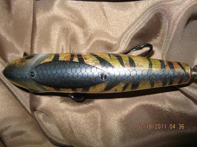 Posts: 248 Location: Xenia, Ohio | Patch on top of lure? This lure I picked up at the Flea market, for $5.00 it is a (PFLUEGER MUSTANG musky lure) they were made 1940's they are a wooden lure and the plate on the top and bottom are bite plates, if musky came up and hit you're bait it would not leave teeth marks in the wood lure that was there theory back in day, I completely stripped the lure to bare wood and then I primed it and then I started the 24k gold leave process, the I started the painting process, the bite plate where all originally nickel platted over brass , matter of fact all the hardware is brass, so I just custom painted all the hardware, hope this helps. Thanks Scotty | ||