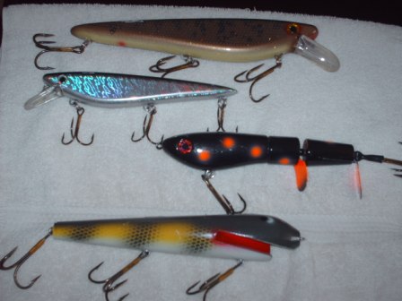| hi guys, after the columbus show i have some new toys so i am going to thin the collection a bit. paypal gift is preffered, pm me first come first serve. add 3$ shipping first lure, 1.50$ after that. the krave is custom painted hog sucker, all pearls, tuff clears, not a "cheap" job, looks great. krave jr is new, never thrown. super topraider and reef hawg are used but in excellent shape. pm me, first come, first serve. i almost forgot, the custom krave has been professionally drilled and had rattles added. sounds great, and different! thanks!