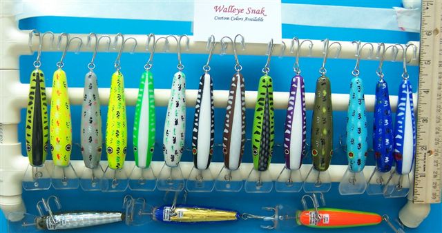 | Just thought I would share a photo of some of the walleye snaks I made this past winter. Let me know your thoughts on the paint colors and paint schemes as I may use some of them for musky baits also. Thanks Ken