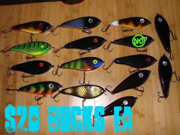 I have custom baits that i want to get rid of before the season so i can do some more. These are all brand new and the finish has never seen water. I am open to trades for hellhounds and phantoms. Otherwise paypal is best. I will NOT be including hooks or rings even though they are in the pics (except for the sea cows they will come with hooks). They have been finished with three coats of ppg autoclear. add 3 dollars to each for shipping. or multiples is flat rate at 3 bucks.