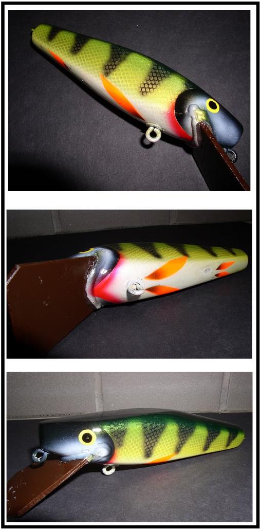 Please excuse the roughness...I'm still just working on an overall lure design, shape, lip angle etc....I have yet to run this....I threw a quick paintjob on it and hardly even sanded it as you can tell. My final run and plans are to finish with E-Tex and use lexan lips....I just want to map out a final design.