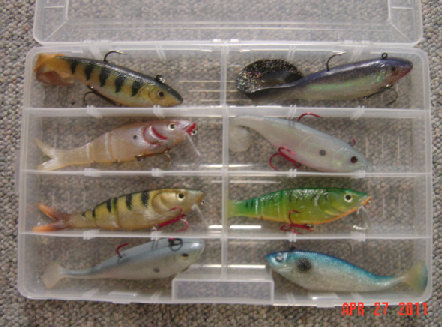 6.5" kickin minnows, seeker shads, wildeye shad, etc. Includes plastic box in picture.