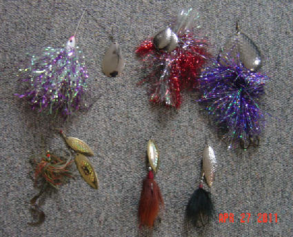 Dbl 12, Harasser, Gerry's Girl Dbl 8, Bucher Willow Buck, unknown #10 flashabou spinnerbait, Grim Reaper spinner bait