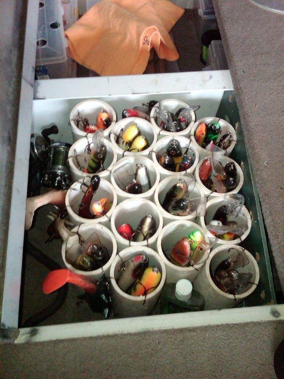 Posts: 388 | Here is a picture of the PVC pipe that was used previously. As you can see, this arrangemetn allowed 2 or three lures instead of 5 per tube with wasted space between tubes and with pipe wall thicknes. Attachments ---------------- IMG00053-20100718-1407.jpg (81KB - 238 downloads) | ||