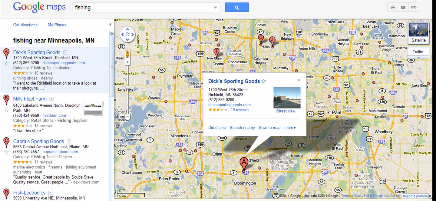 Another good way to find shops is to go to Google Maps and type in where you are going. Expand the map out and then type in keywords like "fishing tackle" or musky and businesses with those tag words will pop up. Like in the below. Love doing this for vacations to find "steak" near my hotel.