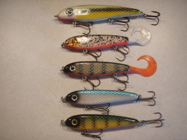 Small Jerk Lot-Beaver Perka?, Big Game Woodrow painted by Mark Smith in yellow crappie, Magic Maker,2-6" Reef Hawgs, Musky Nut Tackle F.I.T. $40 Shipped