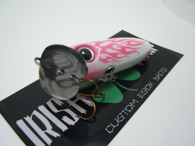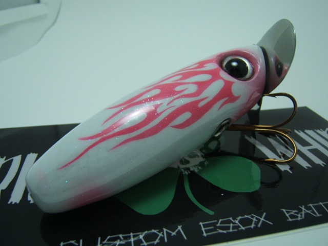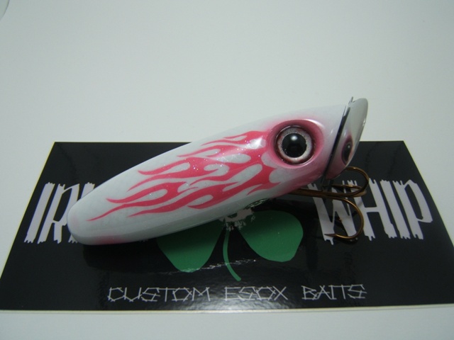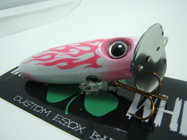 Location: Madison, WI | Here is a Musky Jitter Bug I built by request for a good buddy of mine's wife. Had a lot of fun, it was a real challenge, cutting the flame stencil was a real PIA :uhuh: pearl white/white scale/pink tribal flames. Just waiting for the teaser tail hook to dry (pink head/whit/silver tail) to finish wiring her and she'll be Slay-ready :jump1: