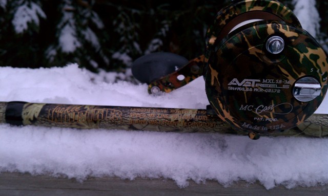 | Here is my Camo set up. I am normally a lefty on bucktails, but when that hand gets tired I go righty. Got my biggest fish for the year on the reel and a TI rod.