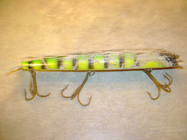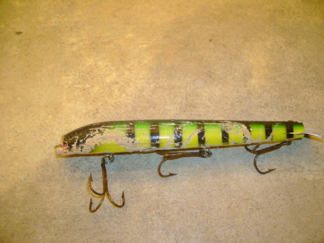 Posts: 173 Location: Probably Minnesota that time... | I would love to post a one or two myself, but I have tended to be a baitswitch guy. I have a number of baits with 1-3 fish. Musky Hunter did an article a few years ago, and there was some serious carnage on some of those baits along with a short summary of the baits history. Example pic of Jackpot 8-fish , biggest 53" This one I picked up for $3 at the Chicago swap, has to be worked real slow, or it won't work, it has become my favorite bait under these.......conditions. or whatever you may want to share. This could be funny too. I thought it was pretty cool , and something different. There was like 5-6 baits that they showed. Any way If you have some, lets see them. Bring on the carnage, -Chris | ||