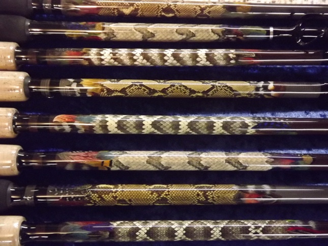 Posts: 909 Location: South-Central VA | Vince, Those snake skin inlays look great and you have a nice variety of skins. Are some of those mangrove snake skins? I do alot of work with snake skins on my lures and a decent amount on rods. I've been looking to get some mangrove snake skins and I was wondering where you source yours from. Do you do the rod building yourself or do you outsource the work? thanks, jeremy | ||