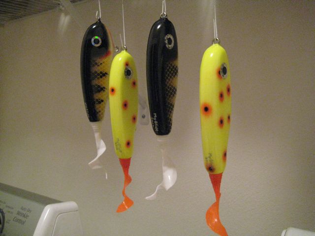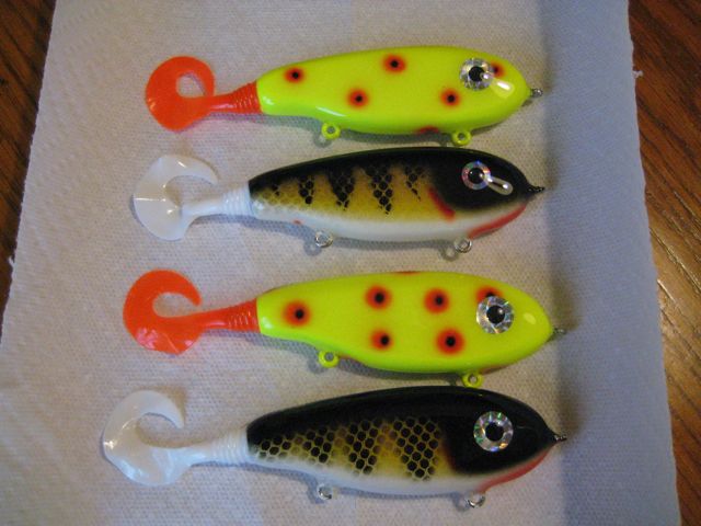 Location: S.Wisconsin | Here are the 4 i made up with my 10 days off. My glides are about 7" with the tail and weigh about 2.75 oz with hooks and rings. they fall about 1' per second. Still pretty new at this but i might have something for the basement baits championship next year. The people on this board do amazing work!