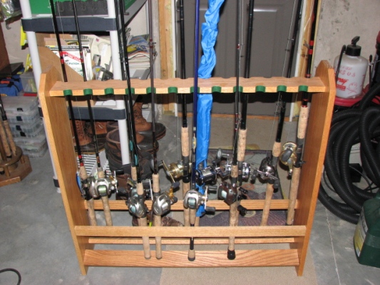 Location: Land of the Musky | erico's picture is almost identical to the ones I buy on eBay for shows but looks 10x stronger and nicer. That in general is a very good design. What I found when buying rod racks for musky rods is that they are NOT setup for musky rods. If you have any extended handles on your rods the foregrip is too high and sits in the half cup and your rod does not want to stay in the rack. Far better off making your own. Please post a few picture when you are done. My buddies dad is planning on making me 2 or 3 24-36 rod units with wheels so I can have between 80-100 rod displays. If I get this made soon I will post detailed pictures for you. |