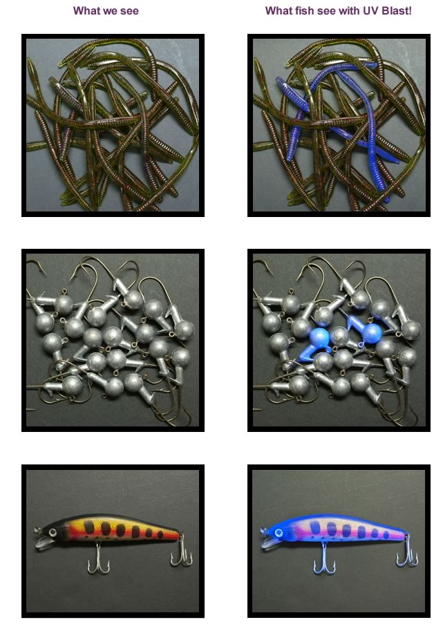 Location: Latitude 41.3016 Longitude 88.6160 | U can make any bait UV with UV BLAST just spray it on a bait for that UV glow. Attachments ---------------- uv-lure-spray-th.jpg (1KB - 233 downloads) uv-before-after.jpg (100KB - 246 downloads) | ||