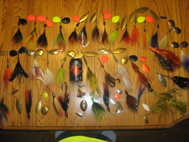 35 Musky/Pike Bucktail and Flashabou spinners for sale, all colors averaging 6 to 8 inches long, most weighing an ounce or more, magnum deep cup blades, .051 wire, too much to list, $140 paypal only, shipping $12 via UPS. i'll send invoice. have to sell, can't muskie fish anymore because of medical reasons