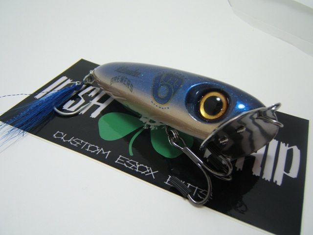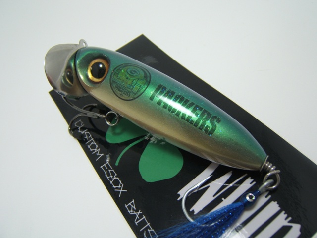 Finally finished up a custom request by my wife for her best friends fathers 60th B-day party. It was a heavy request for me, incorporate the Packers, Brewers, lake cabin, faith and Micky Mantle into one bait (Sorry if you're not from Wisconsin). Anyway this is what I came up with, not complicated, just not really well versed in decal useage. It's finished regardless!