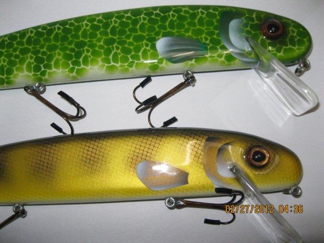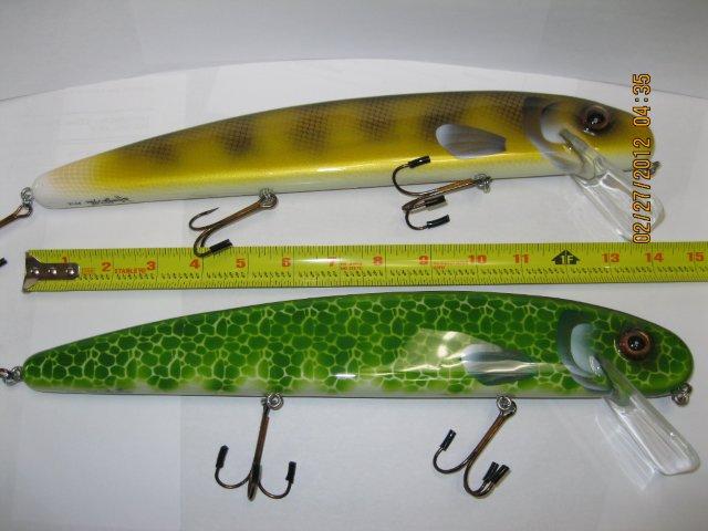 Posts: 248 Location: Xenia, Ohio | Frog and Walleye 12 inches long Attachments ---------------- walleye.jpg (62KB - 145 downloads) walleye1.jpg (39KB - 154 downloads) frog1.jpg (43KB - 147 downloads) frog.jpg (36KB - 156 downloads) | ||