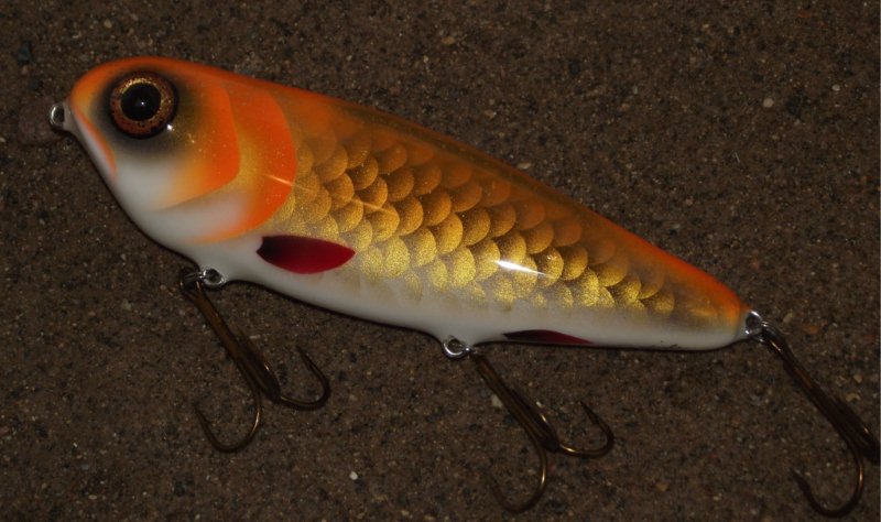 Posts: 432 Location: mpls | First time using gold leafing foil. Turned out pretty cool, but it was definitely a laborious process. I had to work backwards-from the tail forward. Every leaf "scale" that I put down I had to shade before I laid the next row. Wheew! The pics don't do it justice, but you get the idea. The bait is a 2012 "Heckler" topwater . I have been in the process of redoing the shape so that it can accomadate the 7/0 hooks better than the previous style. I will have this new style available at Georges show Joe Attachments ---------------- FLASHY small.jpg (72KB - 428 downloads) HECKLERsmall.jpg (61KB - 387 downloads) smallheckler.jpg (70KB - 722 downloads) | ||