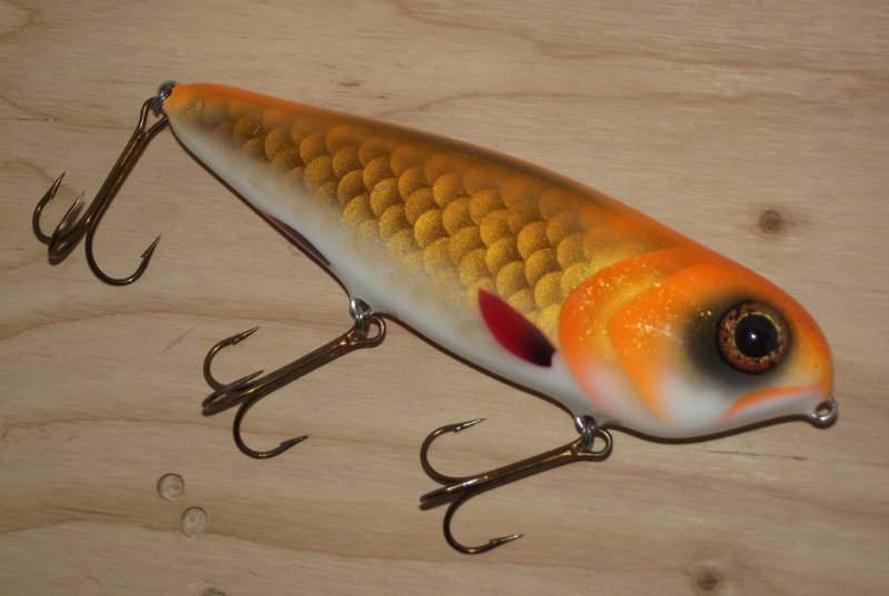 Posts: 278 Location: Finland | wow that looks amazingly cool, i cant believe you decided to do a actual gold leafing. it must have taken forever to do, especially when you have to shade each individual scale, talk about a total pain in the a**. just out of curiosity how long did it take to complete the whole thing? when i do the same thing with paint it takes usually around 15 mins or so to make one bait, of course it depends on the size of the bait too. -Mikko | ||