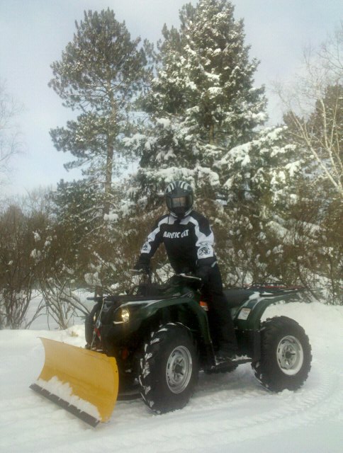 Posts: 13688 Location: minocqua, wi. | North of 8 - 2/29/2012 9:21 PM Sled, how does that four wheeler work when plowing wet heavy snow like that? We hope to move full time in next couple years to where we have a little three season cottage near Rhinelander and the drive way is long. Not looking forward to snow blowing it. this was "THE" test. i had a blower on my tractor for years and finally got sick of 1. removing and replacing mower deck/blower and 2. storing the stupid thing, so i got the blade on the ATV. i love it because now i rarely have to do the plowing because the kids love to do it and it's really convenient and a money/time/storage saver in the long run. i have it on a 450 Grizzly and faced 18" of snow from a dead start in the garage and i figured the odds were against me to make the first run without getting stuck in which case i was phuckled. i lowered the blade about half way and blasted off ... made it!! i cleaned the driveway and our road just fine with it and only used a half a tank of gas. you will love it! ... after this snowfall i'm going to put a blade on my 2nd ATV so that we can have 2 running at the same time. Attachments ---------------- Ice Rig.jpg (74KB - 181 downloads) | ||